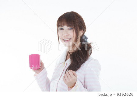 カップを持つパジャマの女性