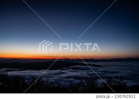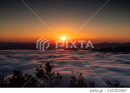朝焼け空を背景にした来日岳から観た雲海の景色 Ver1