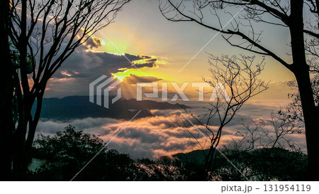 朝焼け空を背景にした来日岳から観た雲海の景色 Ver5