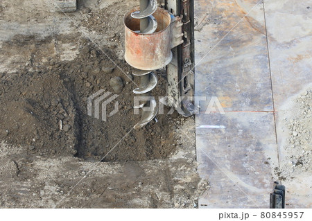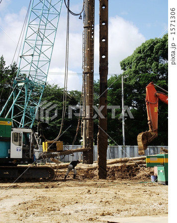 解体工事現場 杭抜き作業中の作業員とオーガ