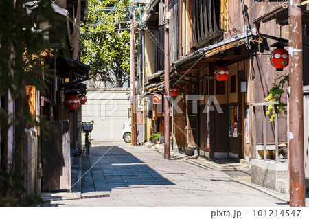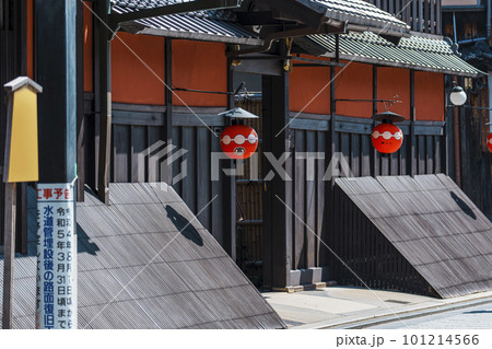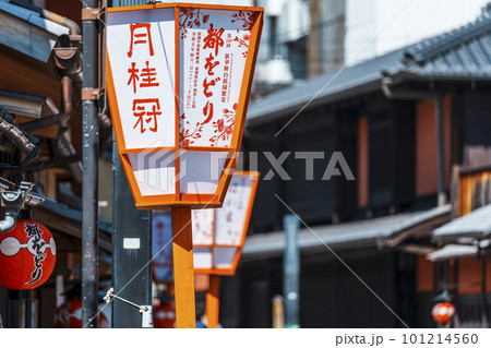 京都祇園の街並み 一力亭 都をどりの提灯 春
