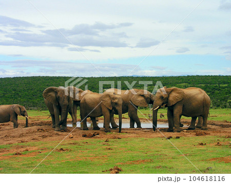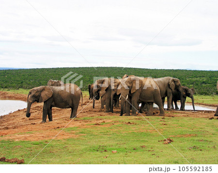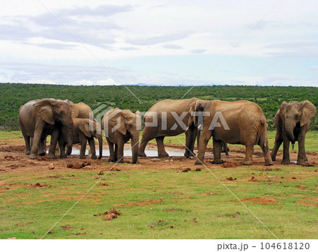 南アフリカ ポートエリザベス アッド・エレファント国立公園の象の群れ