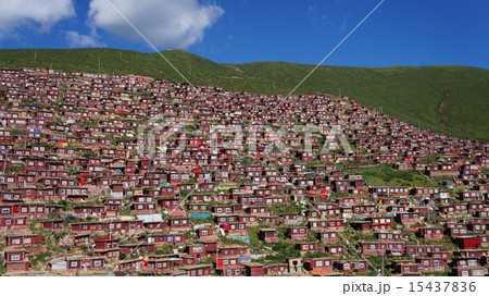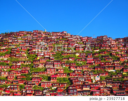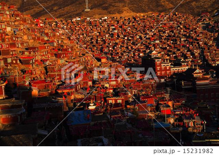 チベット仏教の聖地色達県赤い街ラルンガルゴンパを山の上から見渡した