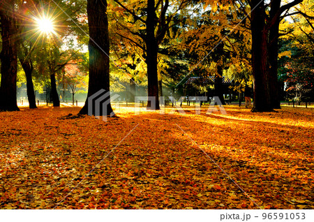 代々木公園の紅葉 晩秋の朝日に映える銀杏林の風景
