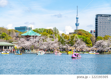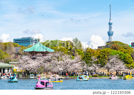 【東京都】上野恩賜公園の不忍池に咲く満開の桜と東京スカイツリー