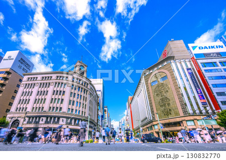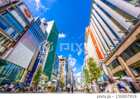 日本の東京都市景観9月2日。東京・銀座。セイコーハウス銀座などを望む