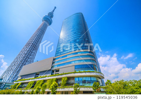 日本の東京都市景観 押上駅や緑に映える東京スカイツリーなどを望む=9月6日