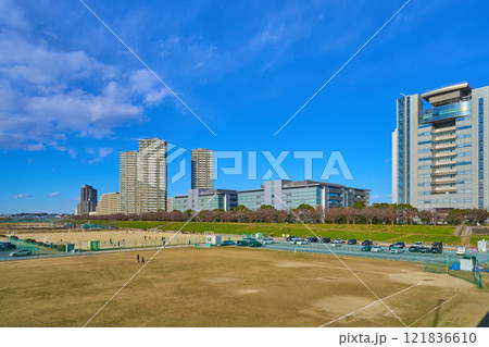 冬の川崎市中原区(東京都大田区)のガス橋から多摩川(丸子橋方面)の水辺の風景