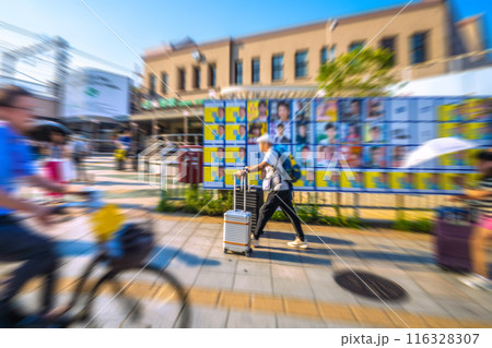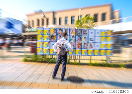 日本の東京都市景観 多摩川駅(東口)前の東京都知事選挙。選挙ポスター掲示場・2024年7月7日投票日