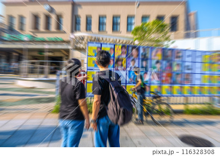 日本の東京都市景観 池袋駅東口。東京都知事選挙の選挙ポスター掲示場・2024年7月7日投票日