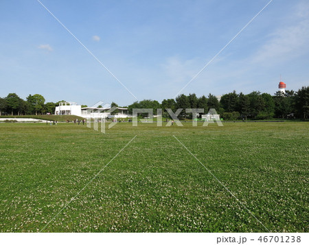 シロツメクサの花に覆われた潮風公園の太陽の広場