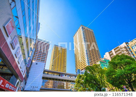 日本の東京都市景観 7月。JR日暮里駅南改札側から夕日を浴びる京成電鉄日暮里駅やタワマンなどを望む
