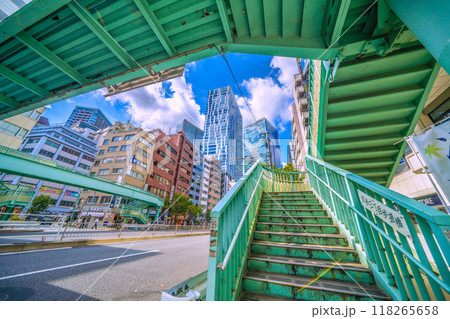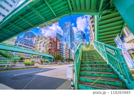 日本の東京都市景観 歩道橋のある街。渋谷橋歩道橋。明治通りや駒沢通り(起点)などを望む。四角形…