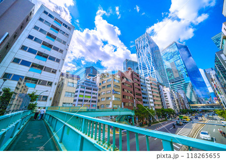 日本の東京都市景観 歩道橋のある街。渋谷橋交差点に架かる渋谷橋歩道橋から渋谷駅前のビル群を望む