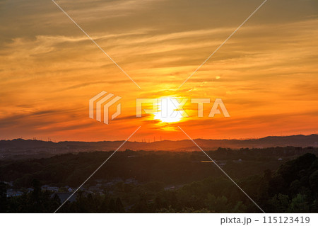 古都奈良東大寺二月堂からの夕景 生駒山系の山並みの上で黄金色に染まった薄雲に覆われながら輝く夕日⑩