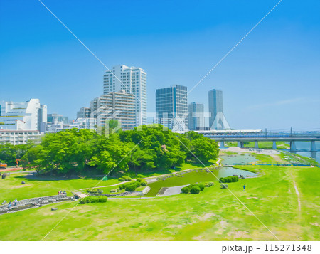 公園の風景 再開発された二子玉川公園とタワーマンション群 東京都世田谷区