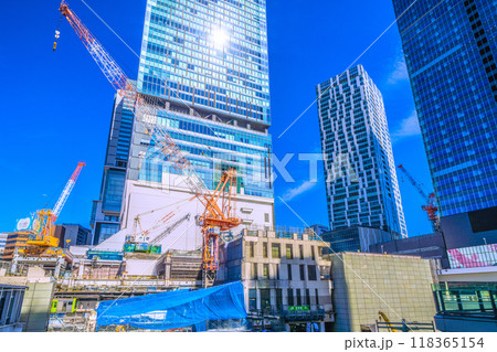 日本の東京都市景観 渋谷ハチ公前広場前から渋谷駅再開発や大型クレーンなどを望む=8月20日
