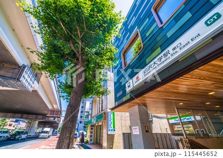 日本の東京都市景観 6月。東急電鉄 駒沢大学駅 駒沢公園口などを望む。画面左奥に東口