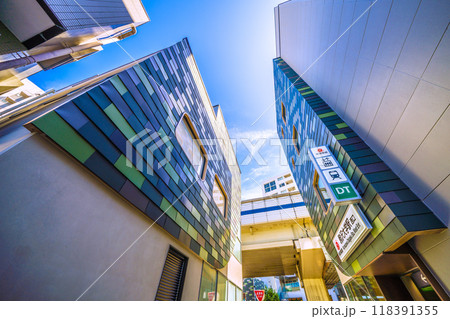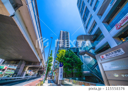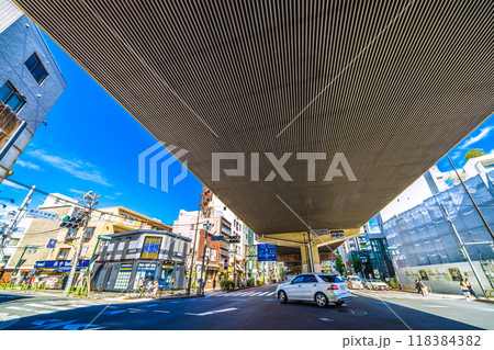 日本の東京都市景観 6月。東急電鉄 駒沢大学駅 東口(画面奥)などを望む