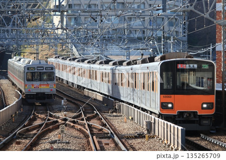 日本の川崎都市景観 溝の口駅から待機中の急行《大井町》と待機ポジションに向かう各停《大井町》(左)