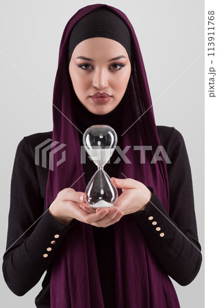 Beautiful arab businesswoman wearing hijab and holding sand clock. Time is passing and it's a pressure concept.