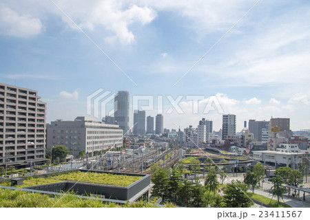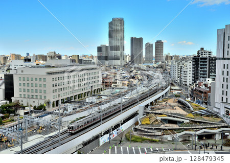 日本の東京都市景観 押上駅前・東京スカイツリー周辺。特急などを望む
