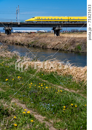晴天の杭瀬川橋梁を走るドクターイエロー