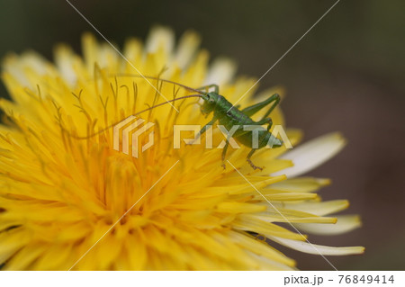 カントウタンポポの上の,ヤブキリ幼虫