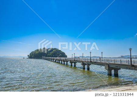蒲郡市の竹島園地と海に架かる竹島橋と竹島の風景(愛知県)