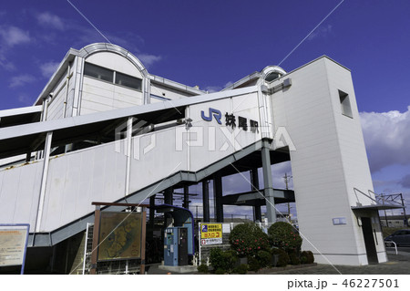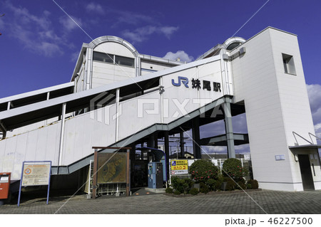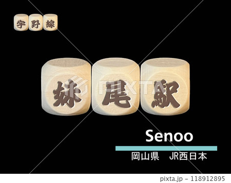 黒背景の前に置かれた駅名ブロック「妹尾駅」