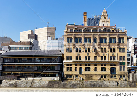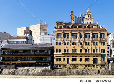 京都のまちなみ 四条大橋からの景色 南側東華菜館等を望む レトロモダン建築