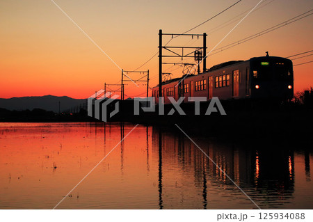 水鏡に映える茜色の夕焼け空とガチャコン電車