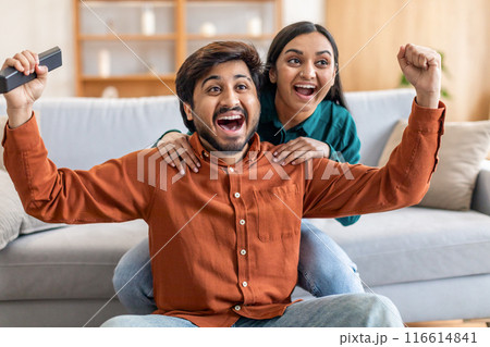 A joyous Indian couple is seen in their living room, celebrating a victory while watching something on TV. Their expressions are filled with excitement and happiness, indicating a successful moment.