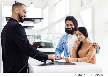 A young Indian couple is in the process of purchasing a new car, as they stand signing documents presented by a friendly salesperson inside a bright car dealership showroom