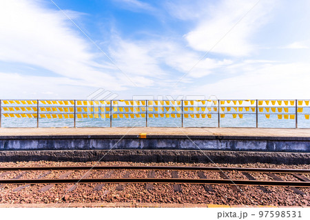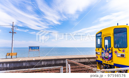 美しい海を背景に黄色い列車「大三東駅」黄色いハンカチとCMロケ地で有名な観光名所:長崎県島原市
