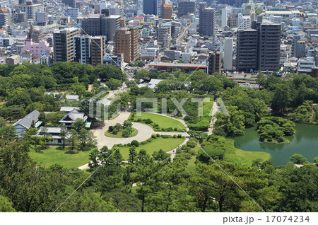 紫雲山から見た栗林公園の商工奨励館と東門、南庭北湖、そして中央通りをはさんで高松市街