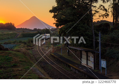 朝焼けの開聞岳を背景に朝日が届く直前の松ヶ浦駅に入線する指宿枕崎線の気動車