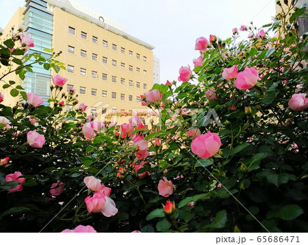 咲き乱れるピンクの薔薇の向こうに見える茶色い建物