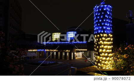 ロシアに侵攻されたウクライナの平和を祈ってウクライナの国旗の色にライトアップされた松原市役所バラ回廊