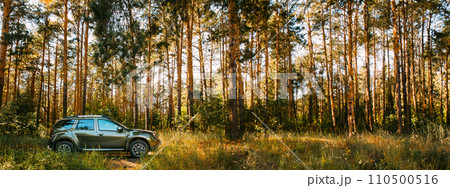 AWD 4WD SUV green car in summer forest landscape in summer field countryside landscape. panorama