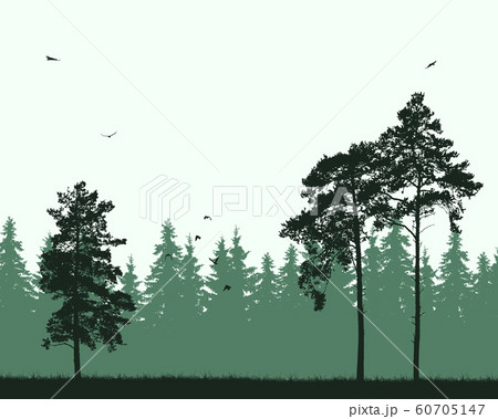 Horizontal illustration of misty evening with trees in meadow and mountain valley.