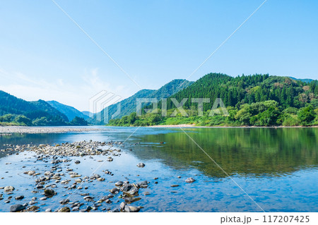新緑とそよ風そよぐ最上川と水上観光船