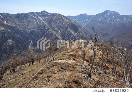 足尾 太平山南西三沢左岸尾根中腹から見る煙害による枯れ木と三沢上流と渡良瀬川源流の山々