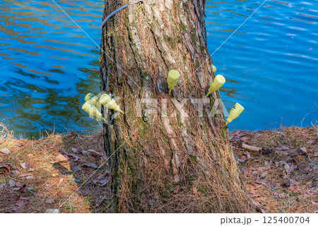 松の木に取り付けた松くい虫対策の樹幹注入剤