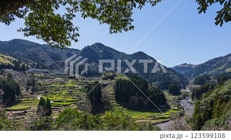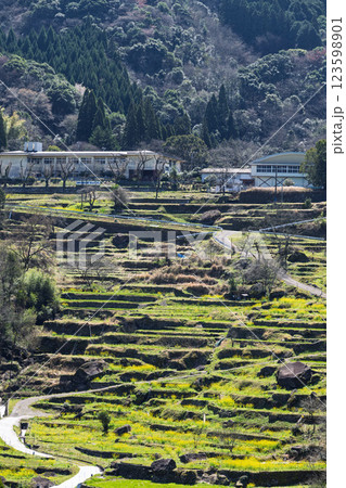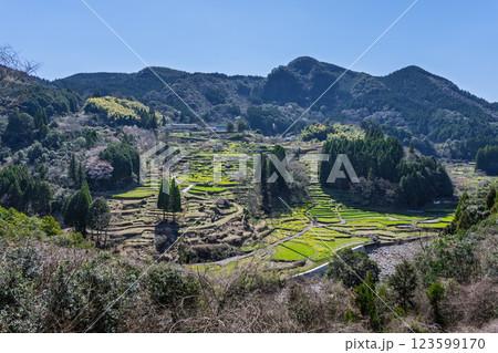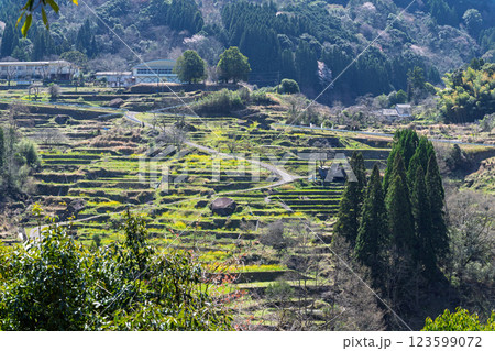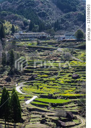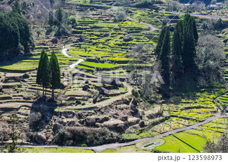 春景色の蓮華・菜の花に映える棚田風景「(日本の棚田百選) 松谷棚田(まつたにたなだ)」人吉・球磨