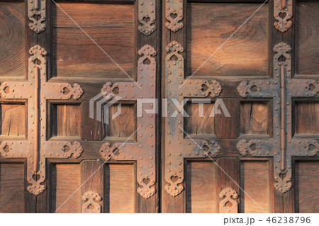 伝統的な日本建築の背景用素材。経年で色褪せた木製の門扉のクローズアップ。