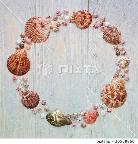 Summer sea shells round frame on wooden planks