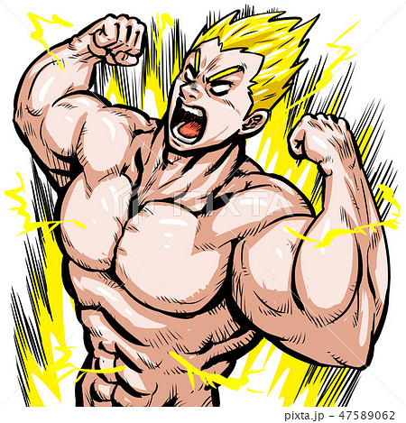ガッツ,逆毛,逆上,絶叫,雄叫び,劇画,漫画,筋肉,ボディビル,マッチョ,ポーズ,正面,白背景,