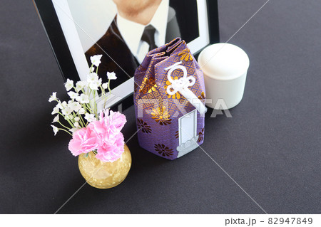 遺影の前におかれた骨壷とフラワーアレンジメント2 終活のイメージ