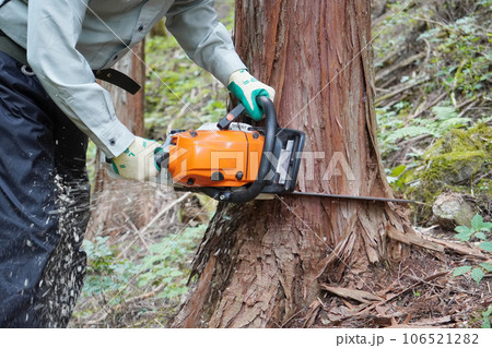 チェンソーを持つ林業、第一次産業のイメージ 木材を切る